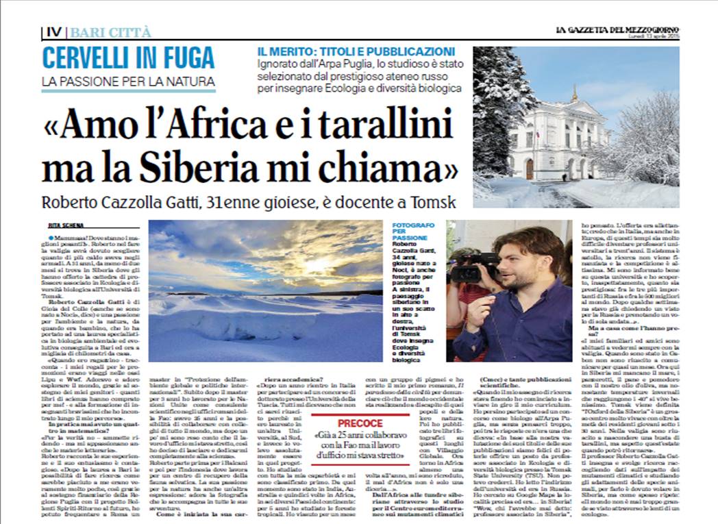 Dall’Africa alle tundre siberiane attraverso lo studio per il Centro euromediterraneo sui mutamenti climatici (Cmcc) e tante pubblicazioni scientifiche. «Quando il mio assegno di ricerca stava finendo ho cominciato a inviare in giro il mio curriculum. Ho persino partecipato ad un concorso come biologo all’Arpa Puglia, ma senza pensarci troppo, poi tra le risposte ce n’era una che diceva: “In base alla nostra valutazione dei suoi titoli e delle sue pubblicazioni siamo felici di poterle offrire un posto da professore associato in Ecologia e diversità biologica presso la Tomsk State University (TSU)”. Non potevo crederci. Ho letto l’indirizzo dell’università ed era in Russia. Ho cercato su Google Maps la località precisa ed era… in Siberia! “Wow, chi l’avrebbe mai detto: professore associato in Siberia”, ho pensato. L’offerta era allettante; credo che in Italia, ma anche in Europa, di questi tempi sia molto difficile diventare professori universitari a trent’anni. Il sistema è satollo, la ricerca non viene finanziata e la competizione è altissima. Mi sono informato bene su questa università e ho scoperto, inaspettatamente, quanto sia prestigiosa: fra le tre più importanti di Russia e fra le 500 migliori al mondo. Dopo qualche settimana stavo già chiedendo un visto per la Russia e prenotando un volo di sola andata…».