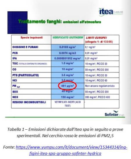 Non essendoci dati ufficiali da parte delle autorità pubbliche, l’unica fonte d’informazione sulle emissioni è la stessa Itea che, in una presentazione divulgativa (https://www.yumpu.com/it/document/view/15344314/ing-figini-itea-spa-gruppo-sofinter-hydrica), riporta i valori di rilascio in atmosfera di inquinanti in seguito ad alcune prove dimostrative. È facile che possa sfuggire a una lettura veloce, tra i tanti numeri “a posto”, ciò che l’azienda riporta nel trattamento dei fanghi, ovvero un’emissione nell’aria “Verificato Isotherm” di 481 µg/m3 di nanoploveri PM 2,5 (come evidenziato nella Tabella 1).