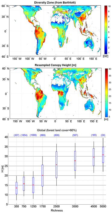Up to date, the difficulty to detect tree’s height by ground and the lack of a comprehensive global flora census has impeded to define a general pattern of forest ecosystem volume and species diversity. Only the recent developments of new powerful technologies, such as Light Detection and Ranging (LiDAR), allowed to map forest vertical structure globally. Together with the availability of new accurate botanical data, such as the NASA Canopy Height Global Map, which is a novelty in satellite technology combined with field analyses, this opens incredible opportunities in ecology. “We investigated – explained Prof. Roberto Cazzolla Gatti – a possible global relation between species richness and canopy height by comparing the high-resolution Global Map of Canopy Height provided by NASA with the Plant Diversity Map produced by Barthlott and colleagues in 2007”.
