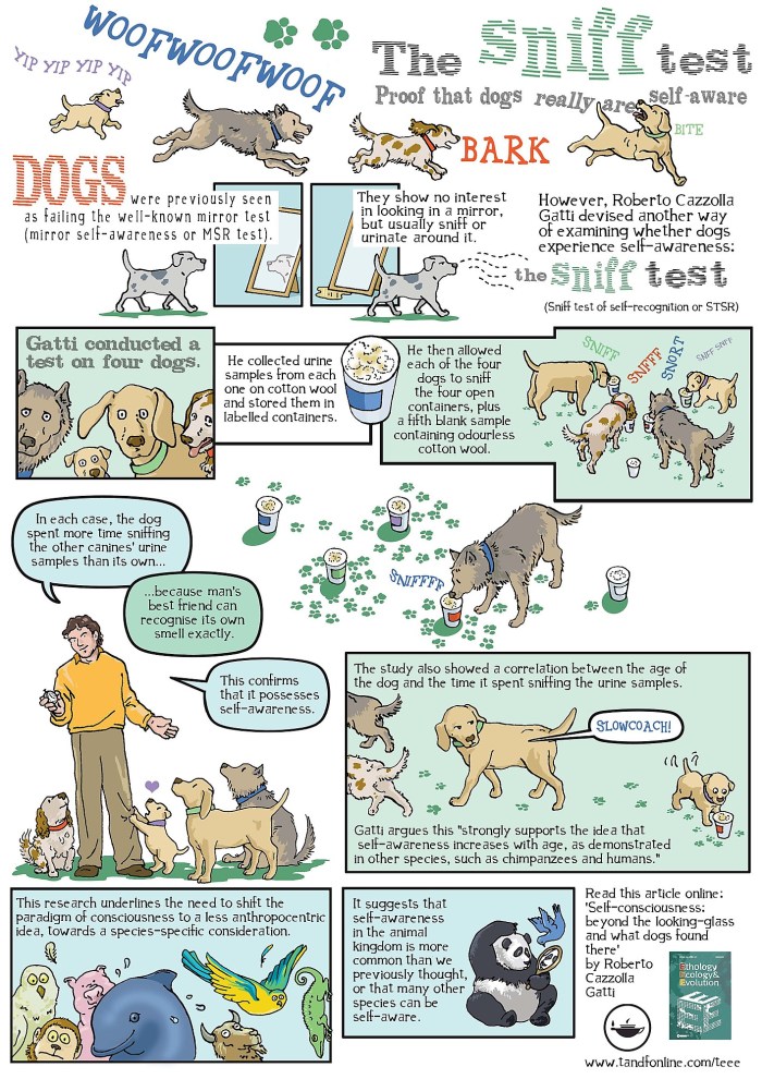 Prof. Cazzolla Gatti’s idea, as recently confirmed by Dr. Horowitz on a larger sample of dogs, shows that “the sniff test of self-recognition (STSR) even when applied to multiple individuals living in groups and with different ages and sexes, provides significant evidence of self-awareness in dogs, and can play a crucial role in showing that this capacity is not a specific feature of only great apes, humans and a few other animals, but it depends on the way in which researchers try to verify it”.