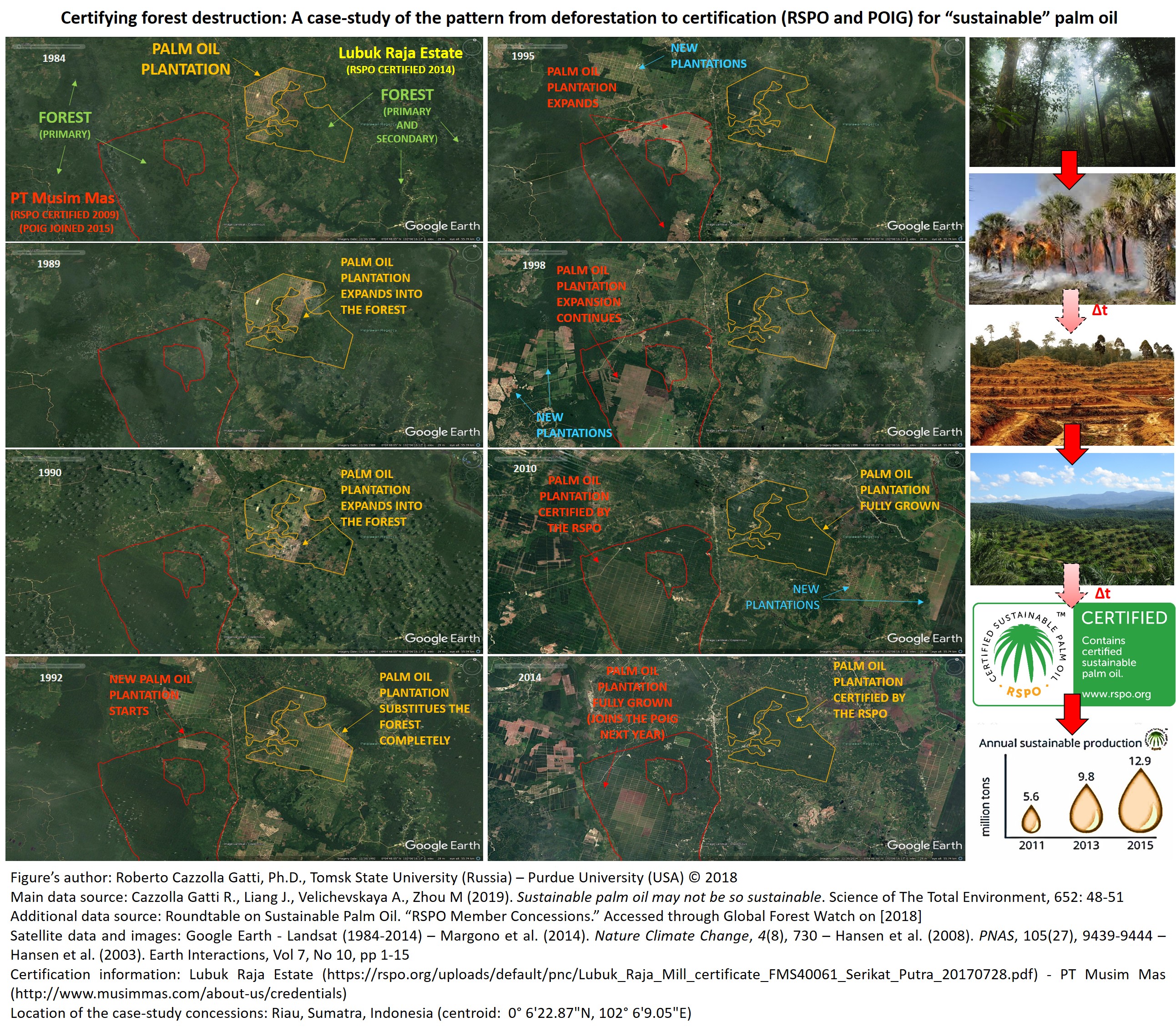 In this time-series of high-resolution satellite images (1984-2014), I show a case-study of two certified palm oil concessions (whose evidence can be extended to the others that are part of our new full-length study). The pattern from deforestation to certification (both by RSPO and POIG), which we anticipated in our paper in the Science of the Total Environment journal, emerges unequivocally. In fact, the two certified palm oil concessions shown in the figure, located in the Riau province in Sumatra, were completely or almost completely primary and secondary forests in 1984 (the oldest satellite image that we were able to gather for the area). Then, from 1984 to 2014 (just during the last 30 years) these two areas proceeded, through a common pattern of deforestation, towards the achievement of RSPO and POIG certifications. The time-series satellite images clearly show the constant rate of forest loss (which almost completely matches tree loss!) during 30 years and the expansion of palm oil plantations into primary and secondary forest, before being certified as “sustainable” (one in 2009 by the RSPO and in 2015 by the POIG, and the other one in 2014 by the RSPO). Furthermore, satellite images show that the establishment of these currently certified concessions may have also facilitated (probably because of the presence of existing infrastructures, such as roads, mills, etc.) the establishment of new plantations in the surrounding areas, increasing – even more – the deforestation of the region.