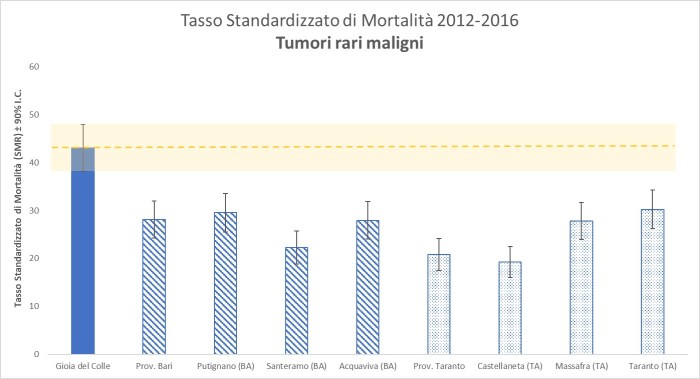 Similmente, il ben più elevato tasso di mortalità per i tumori rari rispetto a tutti i comuni e alle province considerate, suggerisce la presenza di cause ambientali localizzate che favoriscono, tra i residenti di Gioia del Colle, l’insorgenza di tipologie di tumori che si manifestano in misura molto inferiore nei cittadini del territorio circostante.