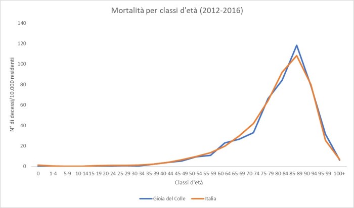 Figura 15 Comparazione tra le curve di mortalità (per tutte le cause di morte) per classi quinquennali di mortalità a livello nazionale (Italia) e comunale (Gioia del Colle) nel periodo 2012-2016