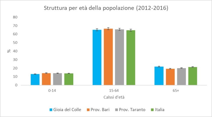 Sono stati utilizzati i dati forniti dall’ISTAT della popolazione residente ad ogni inizio anno, per genere e fasce d’età (0;1-4; 5-9;10-14; …; 95+), dal 01/01/2012 al 01/01/2016 in Italia, nelle Province di Bari e di Taranto e nel territorio del comune di Gioia del Colle.