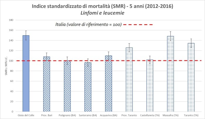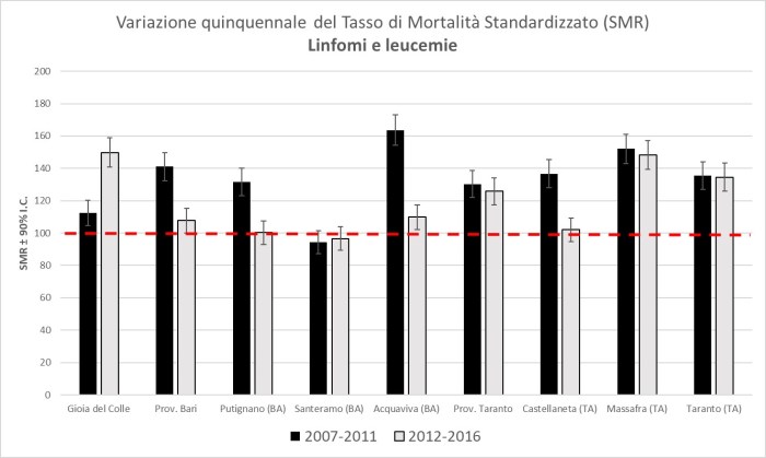 Dall’analisi del decennio 2007-2016, emerge che il tasso di mortalità per leucemie e linfomi nel quinquennio 2012-2016 sia aumentato rispetto al quinquennio 2007-2011 solo nel Comune di Gioia del Colle, mentre è notevolmente diminuito nella Provincia di Bari e nei comuni limitrofi della stessa provincia analizzati e lievemente diminuito persino nei comuni della Provincia di Taranto e nella provincia stessa (Figura 3).