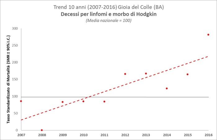 La concomitante ed eccessiva mortalità tra i residenti di Gioia del Colle per tumori del sistema linfatico (in particolare per linfomi e morbo di Hodgkin) e per tumori del fegato e della vescica lascia ipotizzare la presenza sul territorio di una rilevante fonte d’inquinamento chimico-industriale e/o radioattivo tale da incrementare di molto l’insorgenza di simili neoplasie rispetto sia al livello nazionale, sia a quello di molti comuni limitrofi e delle due province analizzate. Il costante trend d’incremento della mortalità per linfomi e morbo di Hodgkin nel decennio 2007-2016 tra i residenti di Gioia del Colle rispetto alla tendenza opposta di decremento nelle due Province di Bari e Taranto, conferma la presenza di una o più, costanti e in aumento nel tempo, sorgenti di contaminazione localizzate sul territorio.