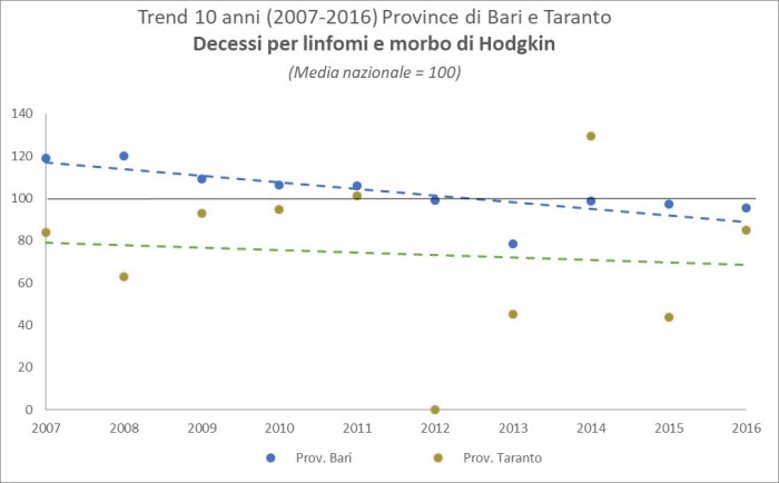 Questo dato appare diametralmente opposto alle tendenze della mortalità per linfomi e morbo di Hodgkin di entrambre le Province di Bari e Taranto nel decennio 2007-2016 che, mostrano un trend decrescente nel tempo, che si allinea al valore medio nazionale nella Provincia di Bari ed è, mediamente, sempre al di sotto in quella di Taranto (Figura 5).