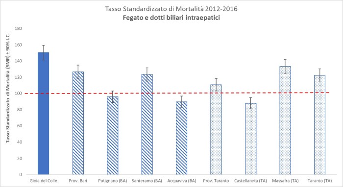 Dall’analisi del tasso standardizzato di mortalità (SMR) degli altri tumori maligni frequenti (ovvero quelli comuni a livello nazionale) nel quinquennio 2012-2016, risultano superiori tra i residenti di Gioia del Colle rispetto alla media nazionale e al tasso di tutti gli altri comuni e delle due province analizzati i tumori del fegato e dei dotti biliari intraepatici (Figura 6).