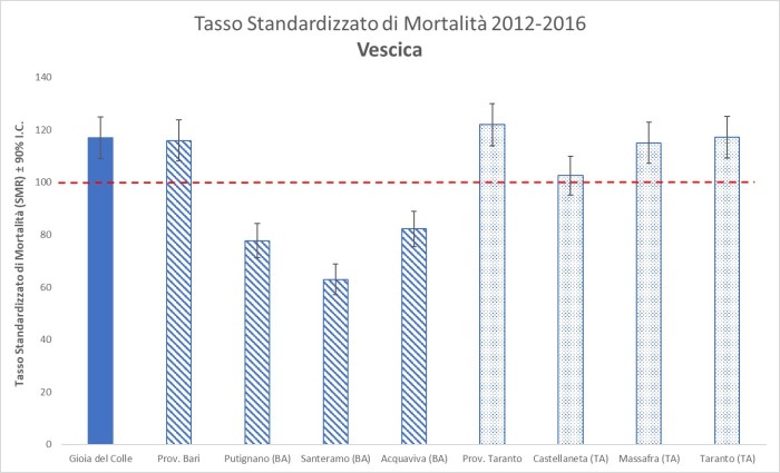 A Gioia del Colle risultano, inoltre, superiori rispetto alla media nazionale e al tasso dei tre comuni della Provincia di Bari e di Castellaneta (TA) i tumori della vescica (Figura 7).