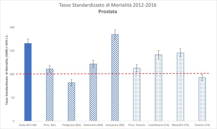 Figura 2 Tasso standardizzato di mortalità (Standardized Mortality Ratio, SMR) per linfomi e leucemie registrati nel comune di Gioia del Colle tra il 2012 e il 2016 confrontato con i valori delle Province di Bari e Taranto e a 3 comuni per ogni provincia. La linea rossa tratteggiata rappresenta il valore nazionale di riferimento = 100