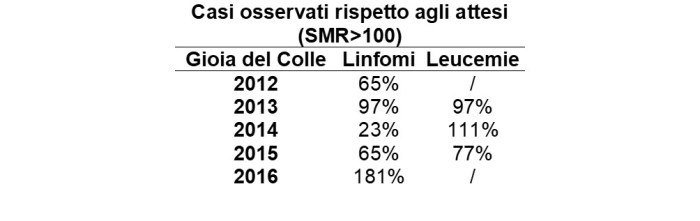 Dal calcolo del numero di decessi osservati rispetto agli attesi (ovvero nei casi in cui il tasso standardizzato di mortalità sul livello nazionale sia >100), risulta che Gioia del Colle ha un tasso di mortalità per linfomi superiore ai valori attesi ogni anno del quinquennio 2012-2016, con tassi particolarmente elevati in 4 anni su 5 e in particolare nel 2016 (181% di mortalità in più rispetto a quella attesa) e un tasso di mortalità per leucemie superiore ai valori attesi in 3 anni su 5 (dal 2013 al 2015) con valori particolarmente elevati in tutto il triennio e in particolare nel 2015 (111% mortalità in più rispetto a quella attesa) (Tabella 1).