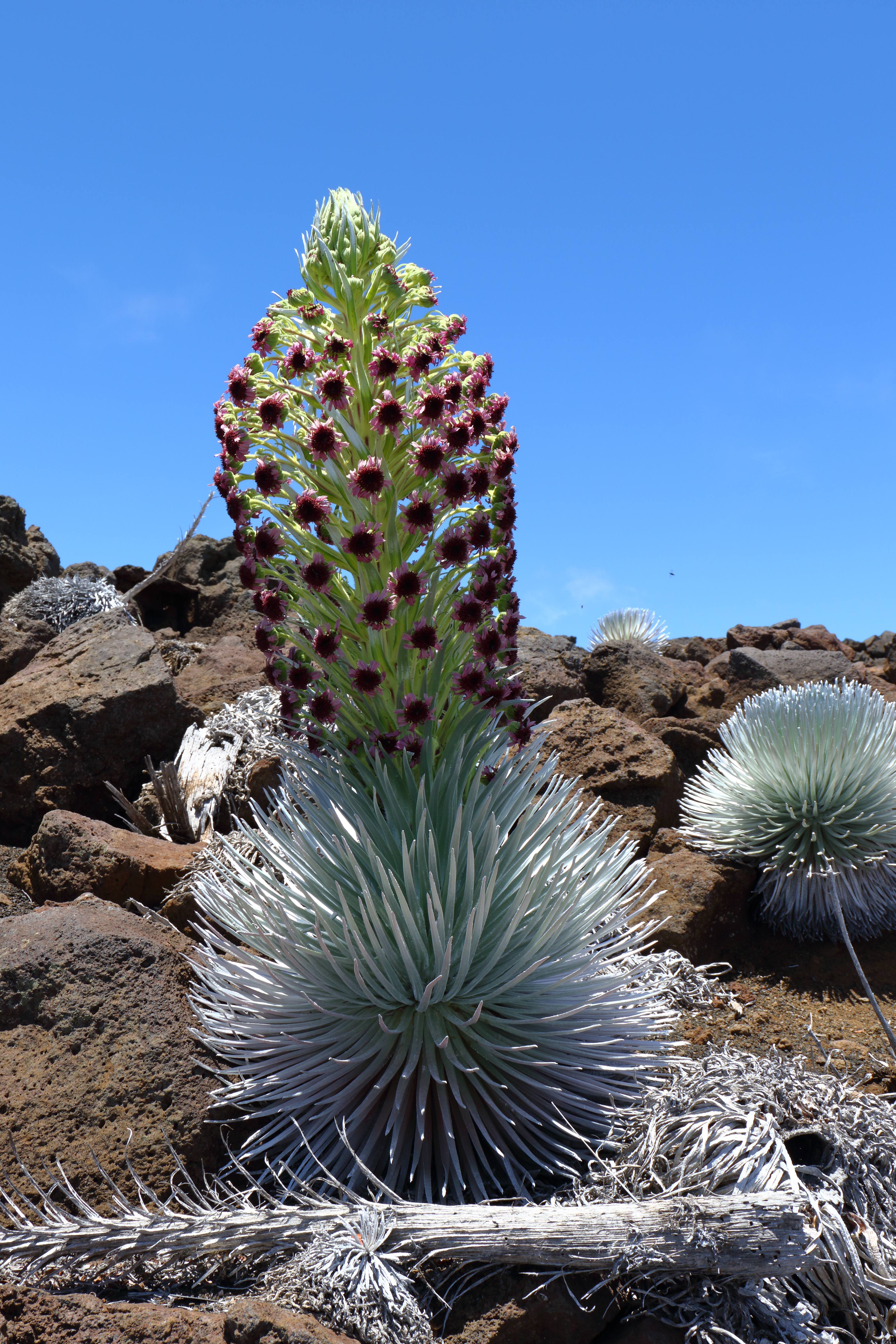 Risalendo verso l’enorme cratere del vulcano, che dà il nome a questo parco e che racchiude in sé decine di altre caldere formatesi durante le eruzioni più recenti che hanno rilasciato colate di lava fino alla costa per quasi 3.000 metri sino a solidificarsi come scogliera rugosa e nera come carbone in mare, ci si imbatte in un’altra rarità delle Hawaii: il silversword di Haleakala. Questa pianta dalle foglie grigio brillante (o ʻāhinahina, in hawaiiano) e dall’enorme infiorescenza, cresce unicamente su alcuni versanti del vulcano ed esplode in tutta la sua bellezza durante le effimere fioriture, punteggiando il paesaggio dal fondo rosso (dal ferro magmatico), giallo (dalle emissioni di zolfo) e nero (dalla roccia vulcanica) con argentee scintille.
