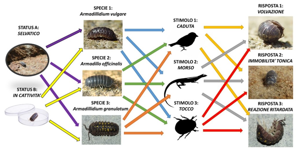 L’esperimento condotto su individui di tre specie di isopodi selvatici e allevati in laboratorio che ha mostrato adattamenti agli stimoli ambientali (predazione) e risposte differenziate in base alla specifica situazione (immagine adattata da: https://www.tandfonline.com/doi/abs/10.1080/03949370.2019.1640799)
