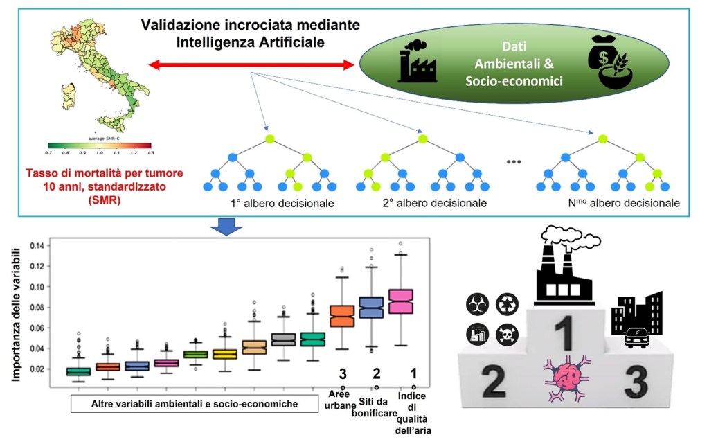 I tumori sono oggi la seconda causa di morte al mondo dopo le malattie cardiovascolari. Negli ultimi decenni di ricerca sul cancro, lo stile di vita (come obesità, abitudini sedentarie, scorretta alimentazione, alcolismo e fumo) e fattori casuali o genetici sono stati individuati come cause principali nello sviluppo dei tumori. Tuttavia, aumenta sempre più la consapevolezza che l’inquinamento ambientale debba essere considerato uno dei principali fattori in grado di indurre la proliferazione tumorale. Nonostante molteplici studi ed evidenze scientifiche preliminari, governi e istituzioni non hanno avviato programmi mirati a comprendere meglio i fattori ambientali del cancro. In nuovo studio, pubblicato in contemporanea, per la parte analitica, sull’autorevole rivista Science of the Total Environment (https://doi.org/10.1016/j.scitotenv.2022.158439) e, per la parte riguardante l’intero dataset decennale (user friendly e accessibile gratuitamente da qualunque cittadino o istituzione italiana e non), sulla prestigiosa rivista del gruppo Nature, Scientific Data (https://doi.org/10.1038/s41597-022-01729-0), con un livello di dettagliato senza precedenti, un team di scienziati delle Università di Bologna e di Bari e del CNR hanno analizzato i legami tra mortalità per cancro, fattori socio-economici e fonti di inquinamento ambientale in Italia, a scala regionale e provinciale, utilizzando innovativi e sofisticati metodi di intelligenza artificiale. Contrariamente a quanto si credesse, i ricercatori hanno scoperto che la mortalità per cancro tra i cittadini italiani non ha una distribuzione né casuale né spazialmente ben definita, ma supera la media nazionale soprattutto quando l’inquinamento ambientale è più elevato in determinate aree del Paese, nonostante le abitudini di vita più sane. L’analisi di ben 35 fonti ambientali di inquinamento (come industrie, pesticidi, inceneritori, traffico automobilistico, etc.) ha mostrato che la qualità dell’aria è al primo posto per importanza per quanto riguarda l’associazione col tasso medio di mortalità per cancro, seguita dai siti da bonificare, dalla presenza di aree urbane e dalla densità dei veicoli a motore. Inoltre, altre specifiche fonti ambientali di inquinamento si sono rivelate significative per la mortalità di alcuni specifici tipi di cancro.