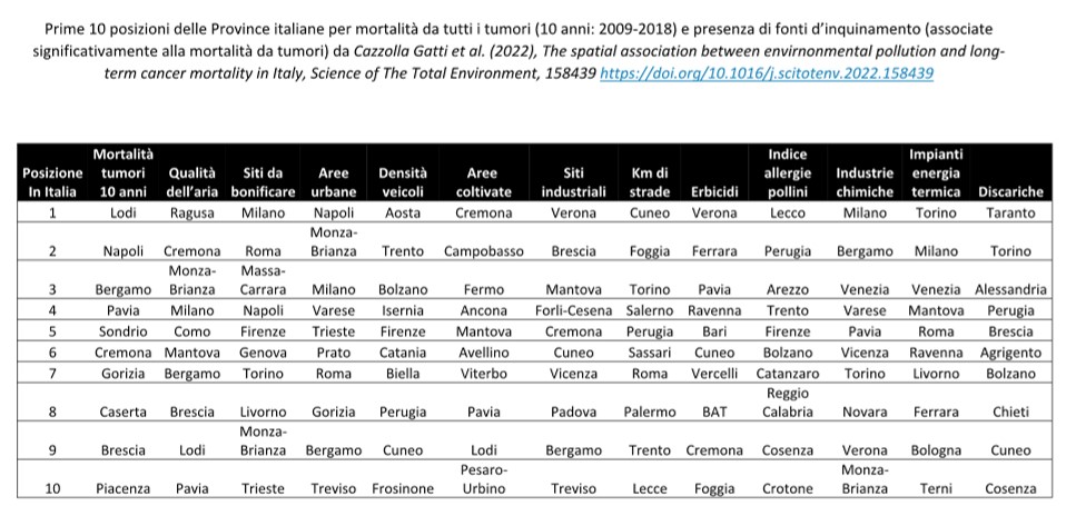 Inoltre, la ricerca appena pubblicata fornirsce un maggiore supporto all’idea che i fattori casuali (spesso semplicisticamente associati alla fortuna o alla sfortuna) non siano i principali elementi scatenanti dei tumori, contrariamente a quanto suggerito finora. Infatti, sono emersi due importanti risultati: il primo è che le regioni italiane con un tasso di mortalità per cancro relativamente alto sono caratterizzate da un grado di inquinamento relativamente elevato, nonostante registrino una frequenza relativamente bassa di fattori generalmente associati al rischio di cancro (come sovrappeso e fumo, basso reddito, alto consumo di carne e basso consumo di frutta/verdura); il secondo è che, a scala provinciale, i tumori maligni e benigni, in generale, e 16 su 23 tipi specifiche tipologie di cancro hanno mostrato un’associazione spaziale significativa con alcune fonti di inquinamento (che spiega più della metà dell’associazione tra ambiente e i tumori), confermando che, nella maggior parte dei casi, l’esposizione a un ambiente contaminato incide notevolemente sulla mortalità per cancro in Italia.